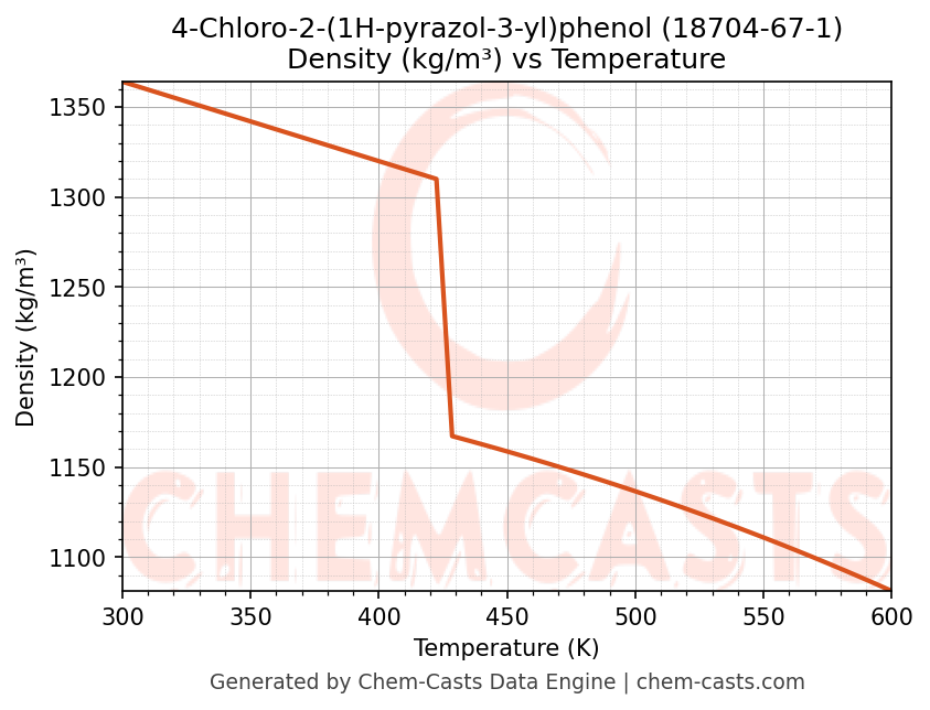 This page presents the temperature-dependent thermodynamic and transport properties of 4-Chloro-2-(1H-pyrazol-3-yl)phenol (CAS 18704-67-1) calculated at a constant pressure of 1 atm (101325 Pa) over the temperature range 250-500 K.