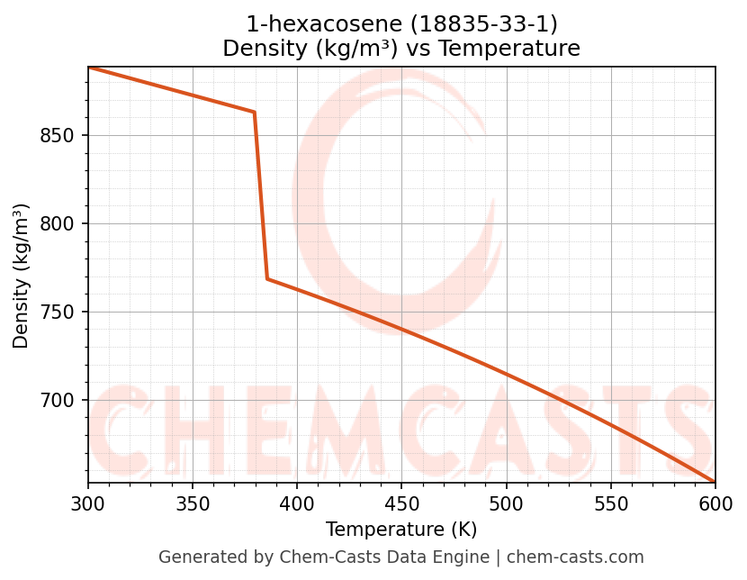 This page presents the temperature-dependent thermodynamic and transport properties of 1-hexacosene (CAS 18835-33-1) calculated at a constant pressure of 1 atm (101325 Pa) over the temperature range 250-500 K.