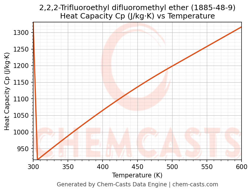 - Specific heat capacity (Cp) indicates the amount of energy required to raise the temperature of 2,2,2-Trifluoroethyl difluoromethyl ether and is critical for energy balance and heat-exchanger design.