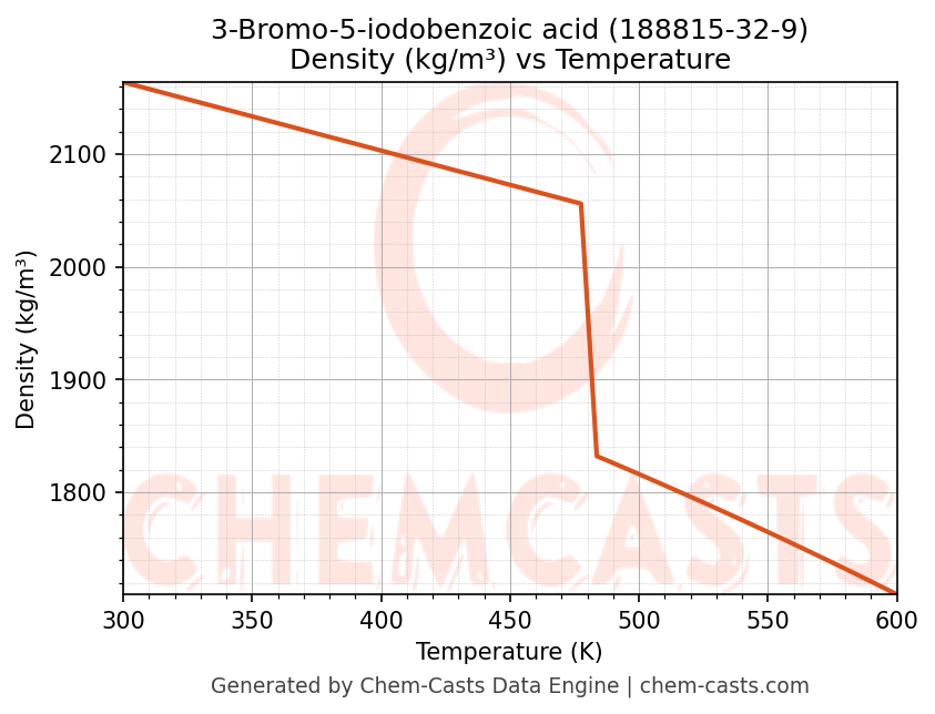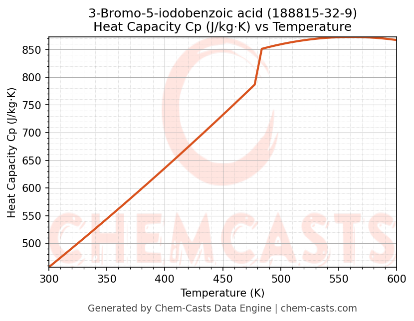 This page presents the temperature-dependent thermodynamic and transport properties of 3-Bromo-5-iodobenzoic acid (CAS 188815-32-9) calculated at a constant pressure of 1 atm (101325 Pa) over the temperature range 250-500 K.