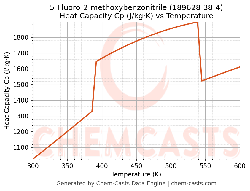 - Specific heat capacity (Cp) indicates the amount of energy required to raise the temperature of 5-Fluoro-2-methoxybenzonitrile and is critical for energy balance and heat-exchanger design.