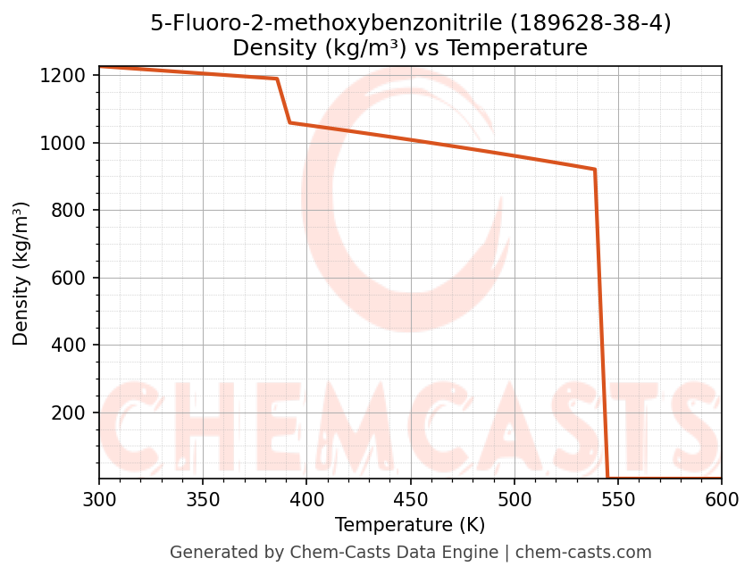 This page presents the temperature-dependent thermodynamic and transport properties of 5-Fluoro-2-methoxybenzonitrile (CAS 189628-38-4) calculated at a constant pressure of 1 atm (101325 Pa) over the temperature range 250-500 K.