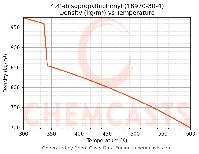 This page presents the temperature-dependent thermodynamic and transport properties of 4,4'-diisopropylbiphenyl (CAS 18970-30-4) calculated at a constant pressure of 1 atm (101325 Pa) over the temperature range 250-500 K.