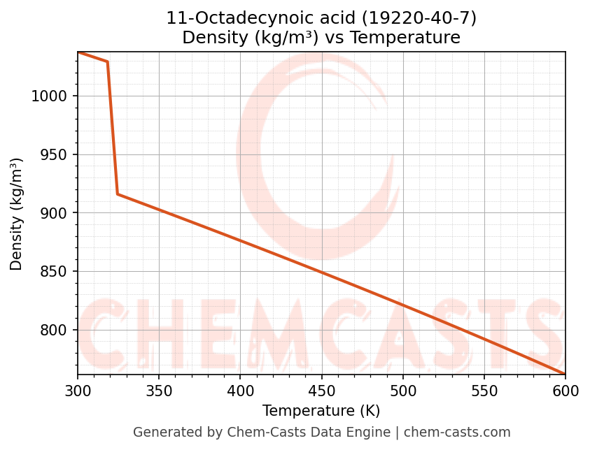 This page presents the temperature-dependent thermodynamic and transport properties of 11-Octadecynoic acid (CAS 19220-40-7) calculated at a constant pressure of 1 atm (101325 Pa) over the temperature range 250-500 K.
