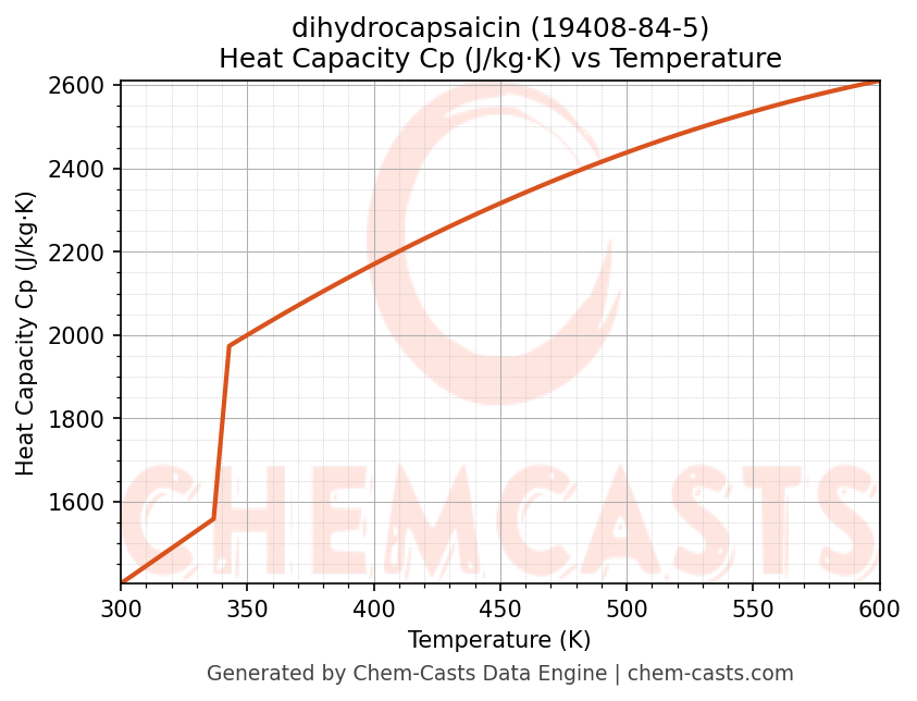 - Specific heat capacity (Cp) indicates the amount of energy required to raise the temperature of dihydrocapsaicin and is critical for energy balance and heat-exchanger design.
