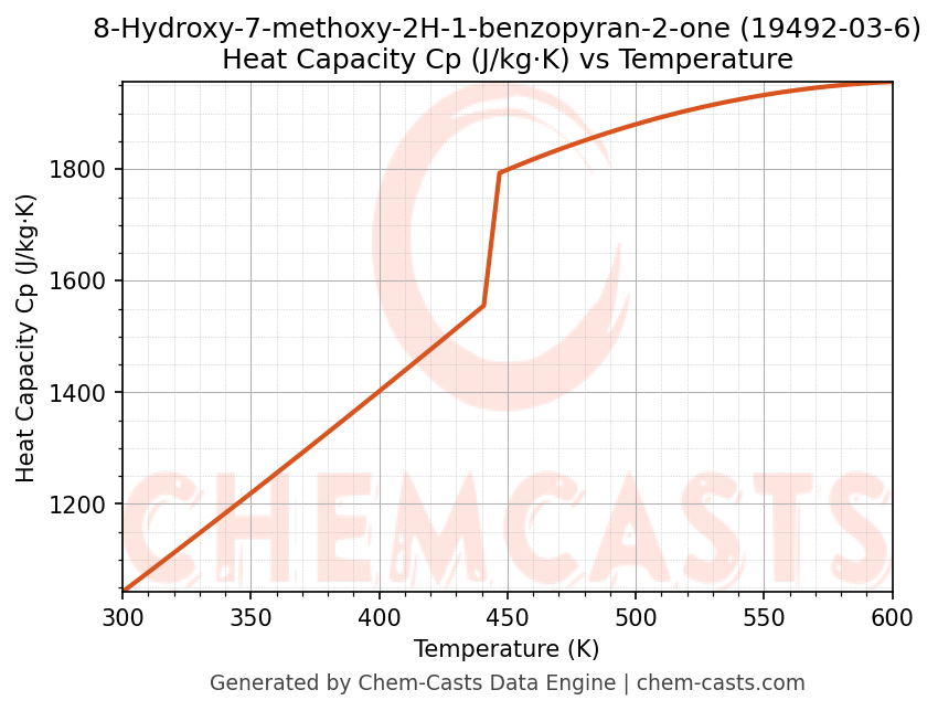 - Specific heat capacity (Cp) indicates the amount of energy required to raise the temperature of 8-Hydroxy-7-methoxy-2H-1-benzopyran-2-one and is critical for energy balance and heat-exchanger design.