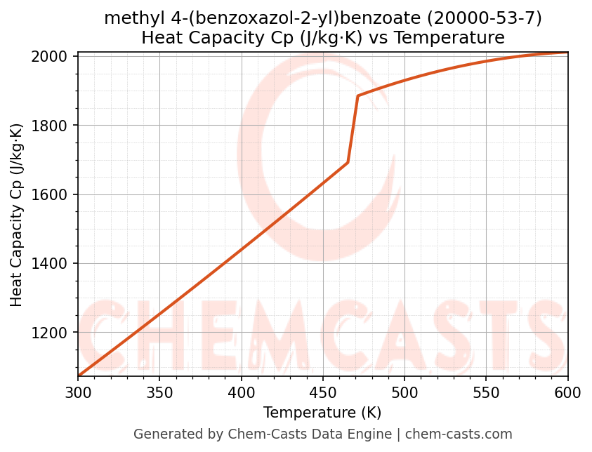 - Specific heat capacity (Cp) indicates the amount of energy required to raise the temperature of methyl 4-(benzoxazol-2-yl)benzoate and is critical for energy balance and heat-exchanger design.