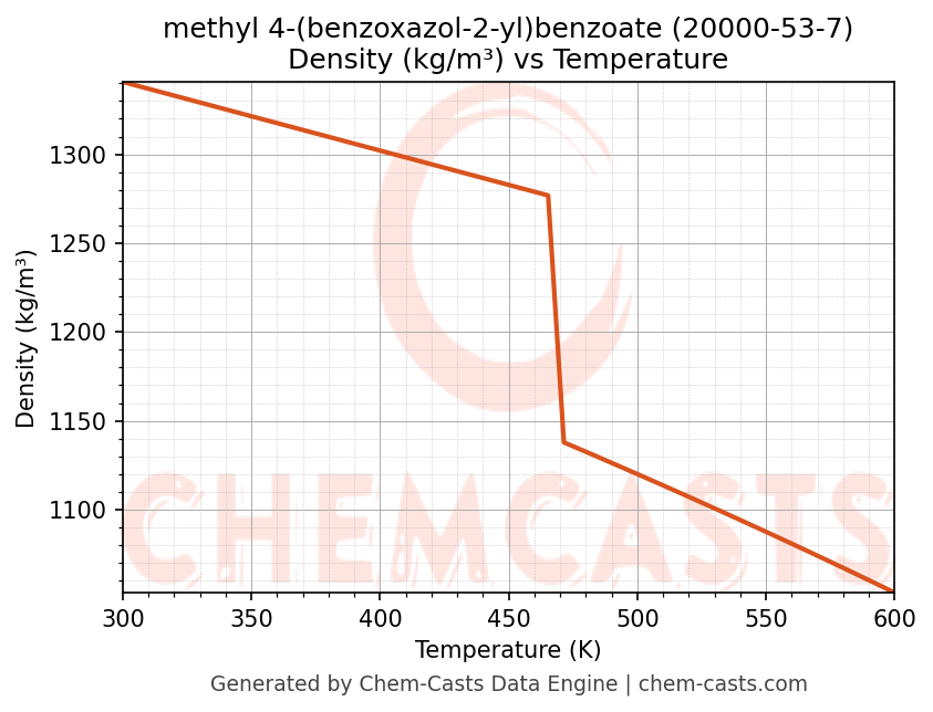 This page presents the temperature-dependent thermodynamic and transport properties of methyl 4-(benzoxazol-2-yl)benzoate (CAS 20000-53-7) calculated at a constant pressure of 1 atm (101325 Pa) over the temperature range 250-500 K.