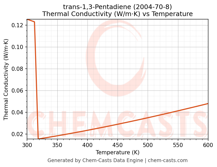 This page presents the temperature-dependent thermodynamic and transport properties of trans-1,3-Pentadiene (CAS 2004-70-8) calculated at a constant pressure of 1 atm (101325 Pa) over the temperature range 250-500 K.