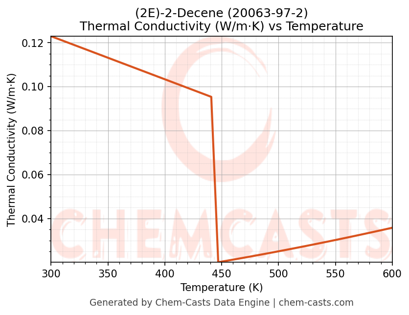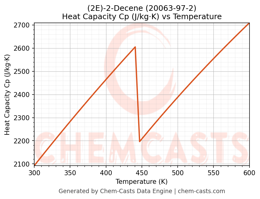 - Specific heat capacity (Cp) indicates the amount of energy required to raise the temperature of (2E)-2-Decene and is critical for energy balance and heat-exchanger design.