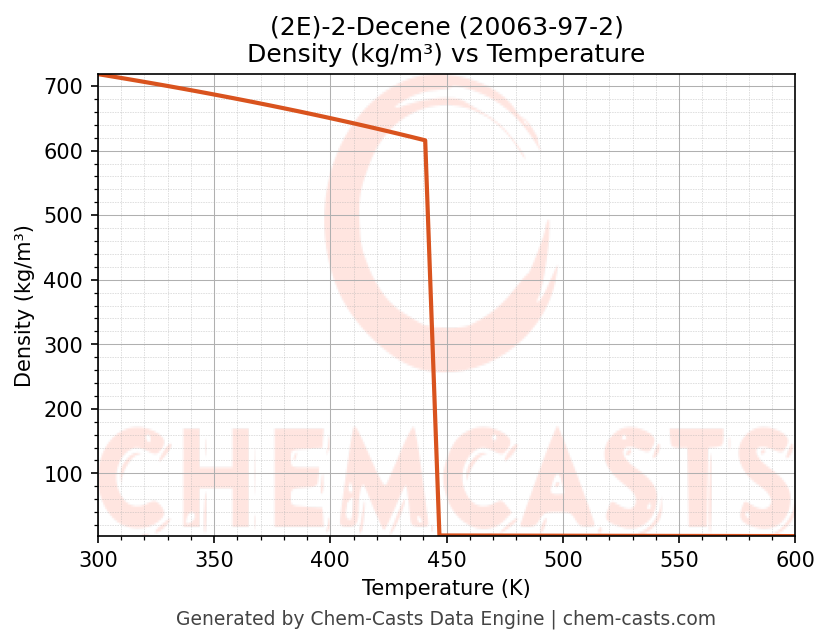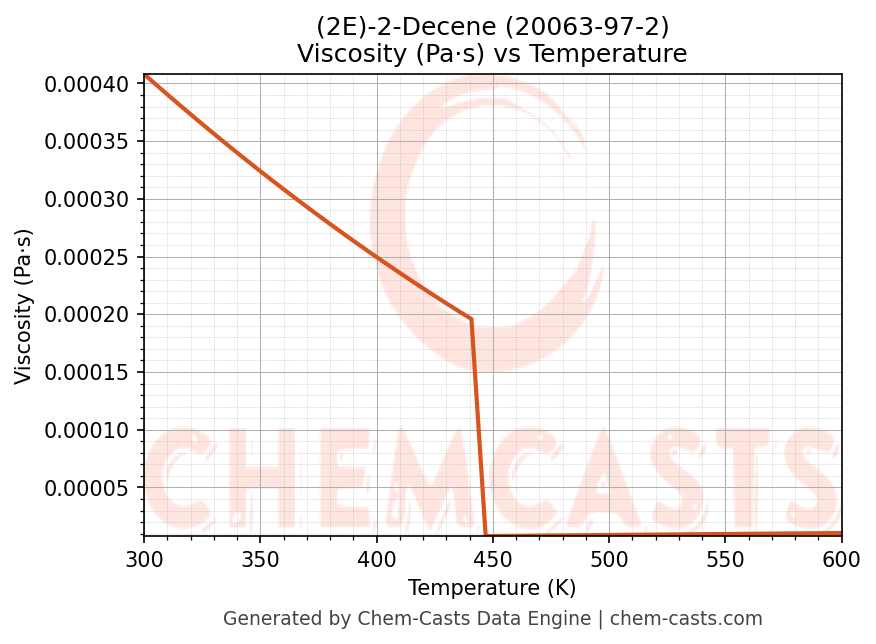 This page presents the temperature-dependent thermodynamic and transport properties of (2E)-2-Decene (CAS 20063-97-2) calculated at a constant pressure of 1 atm (101325 Pa) over the temperature range 250-500 K.