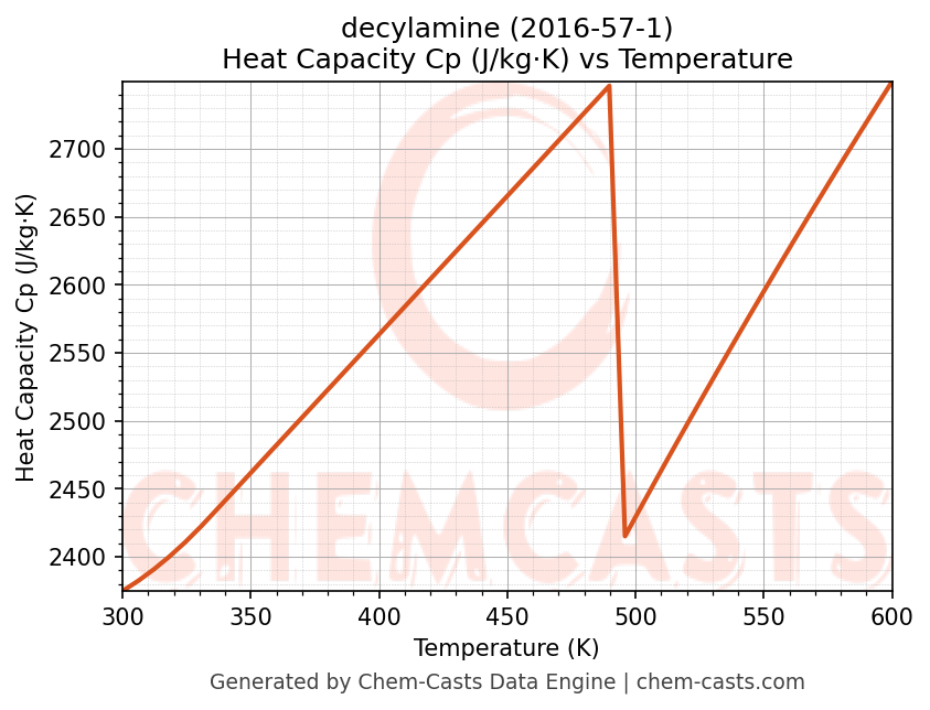 - Specific heat capacity (Cp) indicates the amount of energy required to raise the temperature of decylamine and is critical for energy balance and heat-exchanger design.