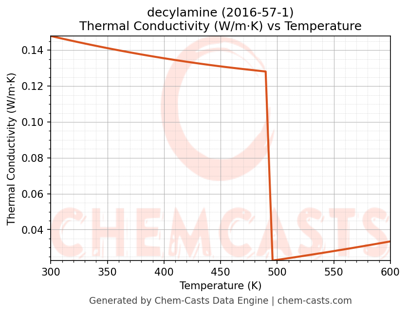 This page presents the temperature-dependent thermodynamic and transport properties of decylamine (CAS 2016-57-1) calculated at a constant pressure of 1 atm (101325 Pa) over the temperature range 250-500 K.