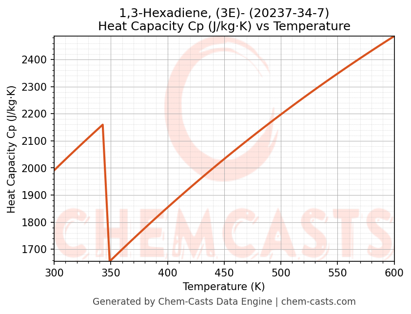 - Specific heat capacity (Cp) indicates the amount of energy required to raise the temperature of 1,3-Hexadiene, (3E)- and is critical for energy balance and heat-exchanger design.