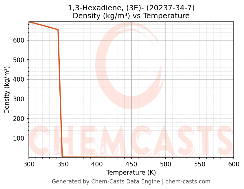 This page presents the temperature-dependent thermodynamic and transport properties of 1,3-Hexadiene, (3E)- (CAS 20237-34-7) calculated at a constant pressure of 1 atm (101325 Pa) over the temperature range 250-500 K.
