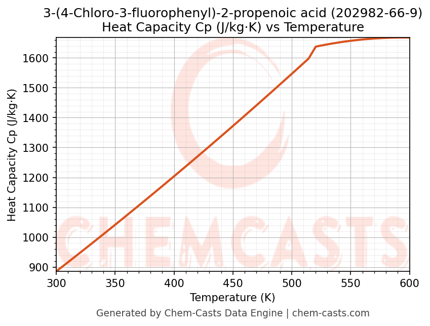 - Specific heat capacity (Cp) indicates the amount of energy required to raise the temperature of 3-(4-Chloro-3-fluorophenyl)-2-propenoic acid and is critical for energy balance and heat-exchanger design.