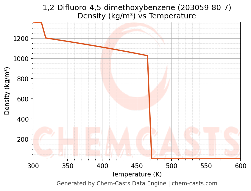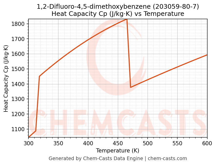 - Specific heat capacity (Cp) indicates the amount of energy required to raise the temperature of 1,2-Difluoro-4,5-dimethoxybenzene and is critical for energy balance and heat-exchanger design.