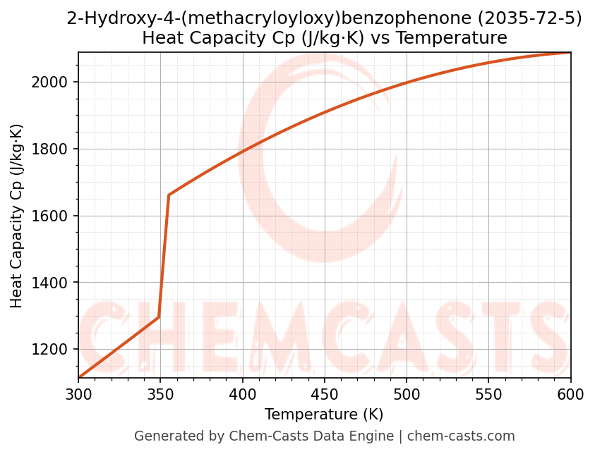 - Specific heat capacity (Cp) indicates the amount of energy required to raise the temperature of 2-Hydroxy-4-(methacryloyloxy)benzophenone and is critical for energy balance and heat-exchanger design.