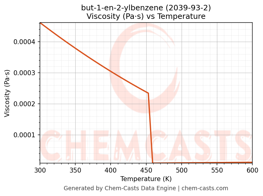 This page presents the temperature-dependent thermodynamic and transport properties of but-1-en-2-ylbenzene (CAS 2039-93-2) calculated at a constant pressure of 1 atm (101325 Pa) over the temperature range 250-500 K.