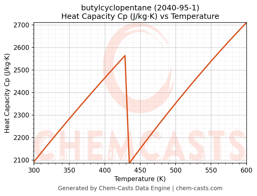 - Specific heat capacity (Cp) indicates the amount of energy required to raise the temperature of butylcyclopentane and is critical for energy balance and heat-exchanger design.