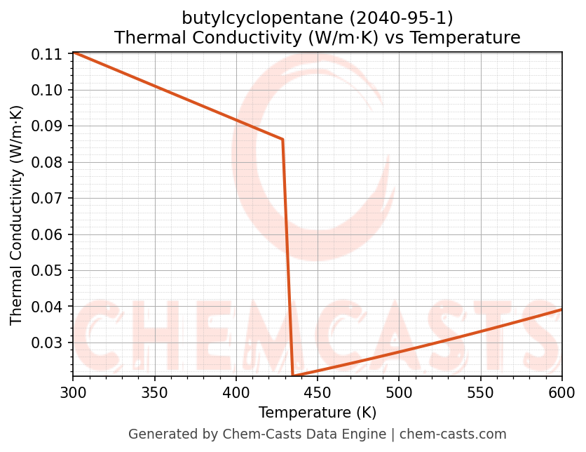 This page presents the temperature-dependent thermodynamic and transport properties of butylcyclopentane (CAS 2040-95-1) calculated at a constant pressure of 1 atm (101325 Pa) over the temperature range 250-500 K.