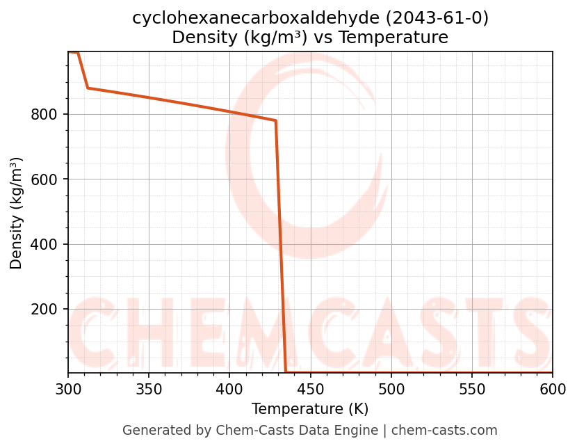 This page presents the temperature-dependent thermodynamic and transport properties of cyclohexanecarboxaldehyde (CAS 2043-61-0) calculated at a constant pressure of 1 atm (101325 Pa) over the temperature range 250-500 K.