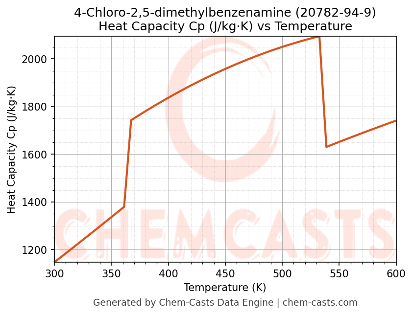 - Specific heat capacity (Cp) indicates the amount of energy required to raise the temperature of 4-Chloro-2,5-dimethylbenzenamine and is critical for energy balance and heat-exchanger design.