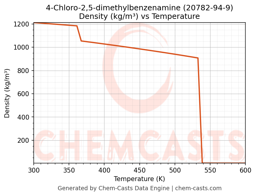 This page presents the temperature-dependent thermodynamic and transport properties of 4-Chloro-2,5-dimethylbenzenamine (CAS 20782-94-9) calculated at a constant pressure of 1 atm (101325 Pa) over the temperature range 250-500 K.