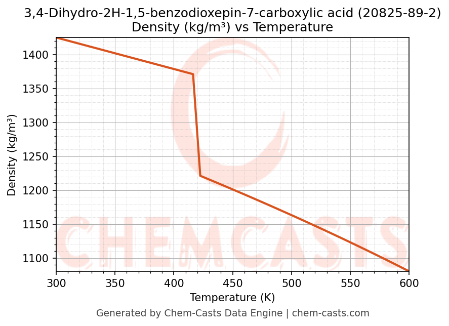 This page presents the temperature-dependent thermodynamic and transport properties of 3,4-Dihydro-2H-1,5-benzodioxepin-7-carboxylic acid (CAS 20825-89-2) calculated at a constant pressure of 1 atm (101325 Pa) over the temperature range 250-500 K.