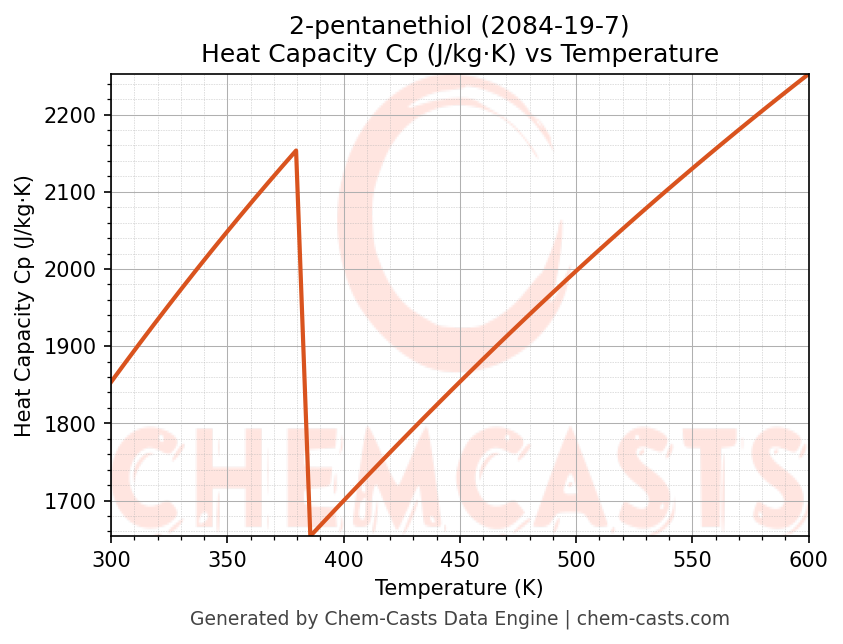 - Specific heat capacity (Cp) indicates the amount of energy required to raise the temperature of 2-pentanethiol and is critical for energy balance and heat-exchanger design.