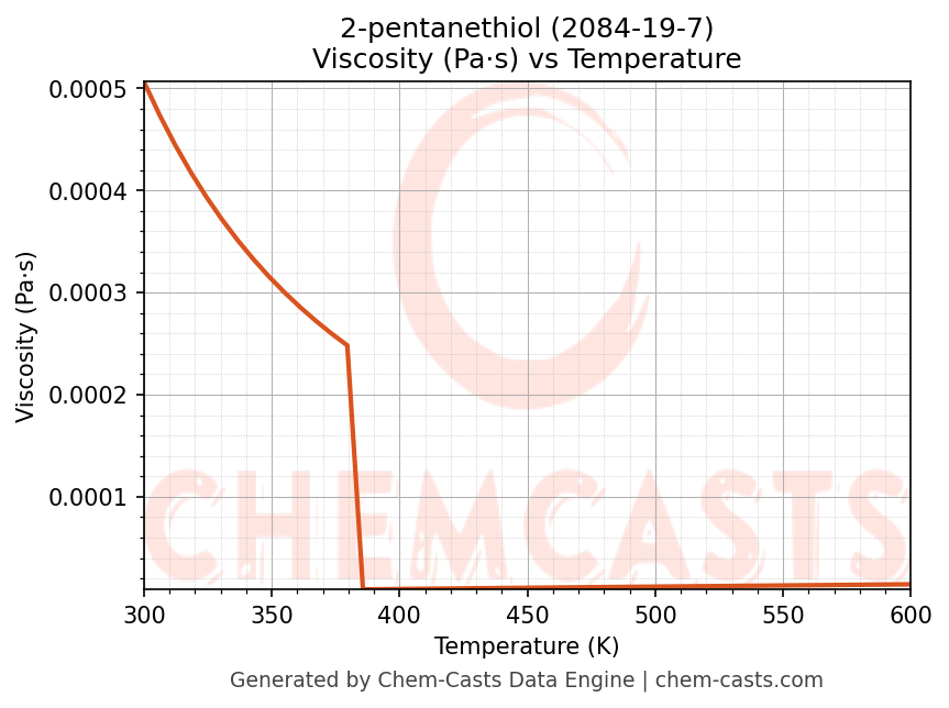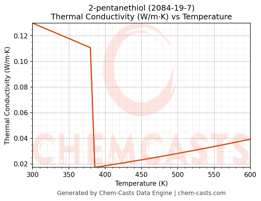 This page presents the temperature-dependent thermodynamic and transport properties of 2-pentanethiol (CAS 2084-19-7) calculated at a constant pressure of 1 atm (101325 Pa) over the temperature range 250-500 K.