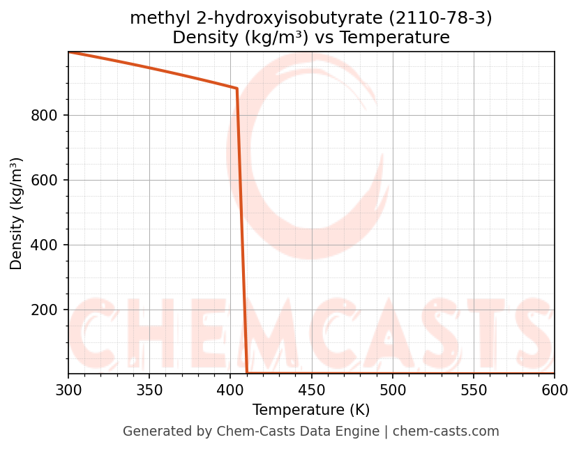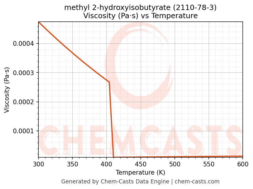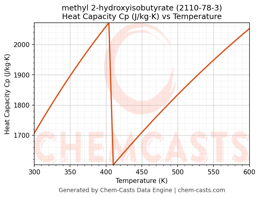 This page presents the temperature-dependent thermodynamic and transport properties of methyl 2-hydroxyisobutyrate (CAS 2110-78-3) calculated at a constant pressure of 1 atm (101325 Pa) over the temperature range 250-500 K.