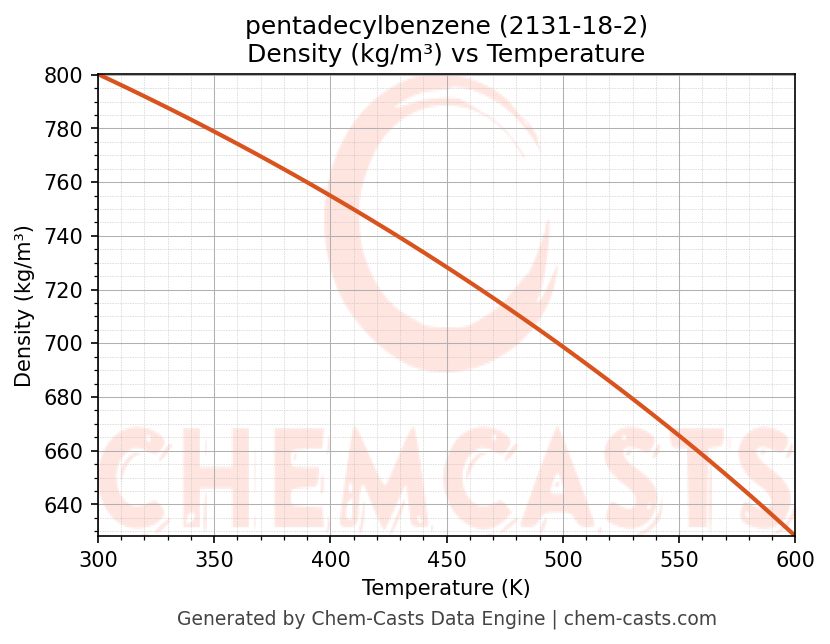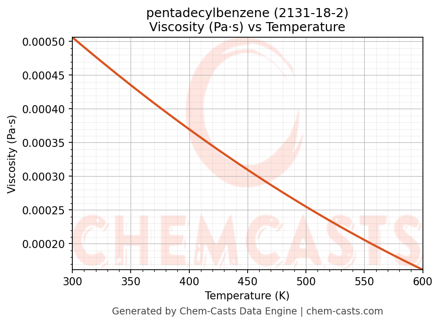 This page presents the temperature-dependent thermodynamic and transport properties of pentadecylbenzene (CAS 2131-18-2) calculated at a constant pressure of 1 atm (101325 Pa) over the temperature range 250-500 K.