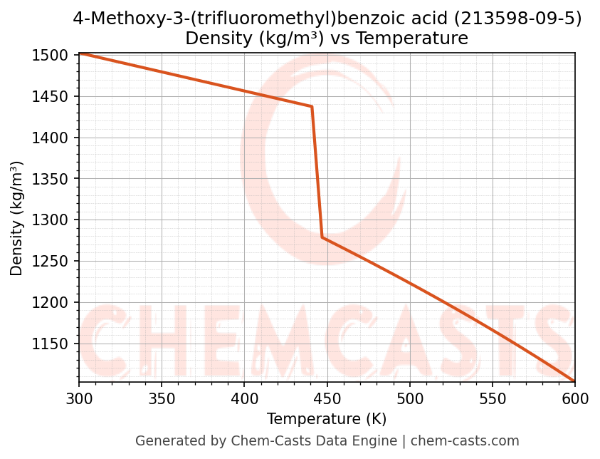 This page presents the temperature-dependent thermodynamic and transport properties of 4-Methoxy-3-(trifluoromethyl)benzoic acid (CAS 213598-09-5) calculated at a constant pressure of 1 atm (101325 Pa) over the temperature range 250-500 K.