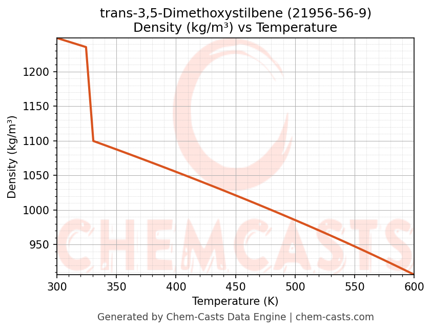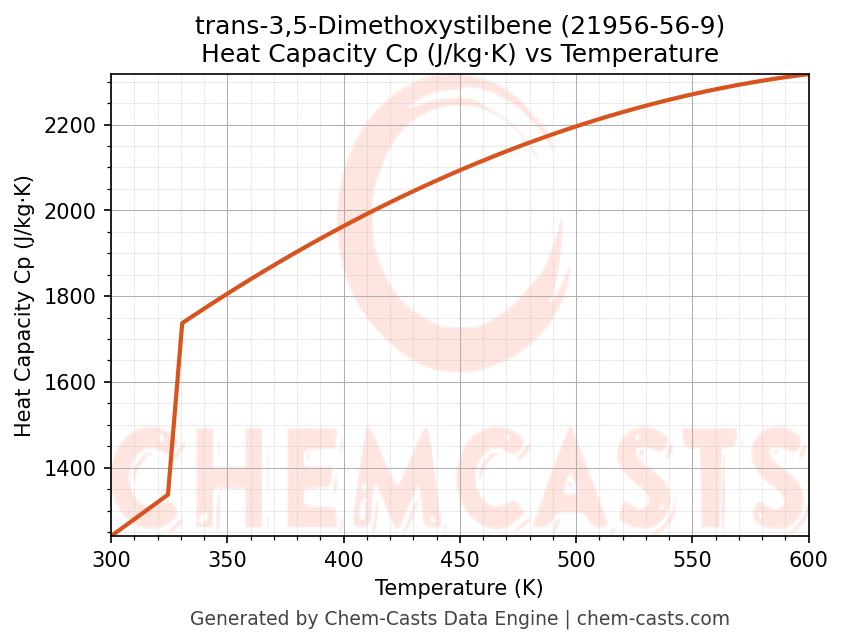 - Specific heat capacity (Cp) indicates the amount of energy required to raise the temperature of trans-3,5-Dimethoxystilbene and is critical for energy balance and heat-exchanger design.