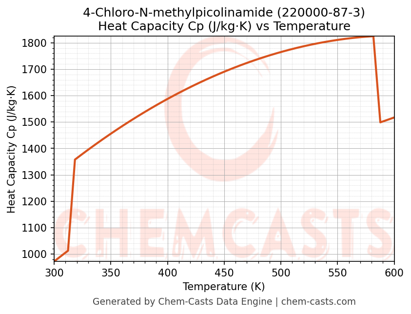 - Specific heat capacity (Cp) indicates the amount of energy required to raise the temperature of 4-Chloro-N-methylpicolinamide and is critical for energy balance and heat-exchanger design.