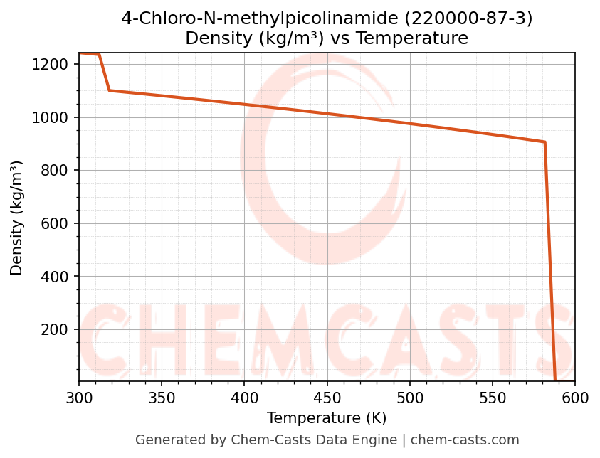 This page presents the temperature-dependent thermodynamic and transport properties of 4-Chloro-N-methylpicolinamide (CAS 220000-87-3) calculated at a constant pressure of 1 atm (101325 Pa) over the temperature range 250-500 K.