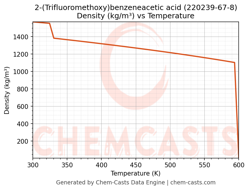 This page presents the temperature-dependent thermodynamic and transport properties of 2-(Trifluoromethoxy)benzeneacetic acid (CAS 220239-67-8) calculated at a constant pressure of 1 atm (101325 Pa) over the temperature range 250-500 K.