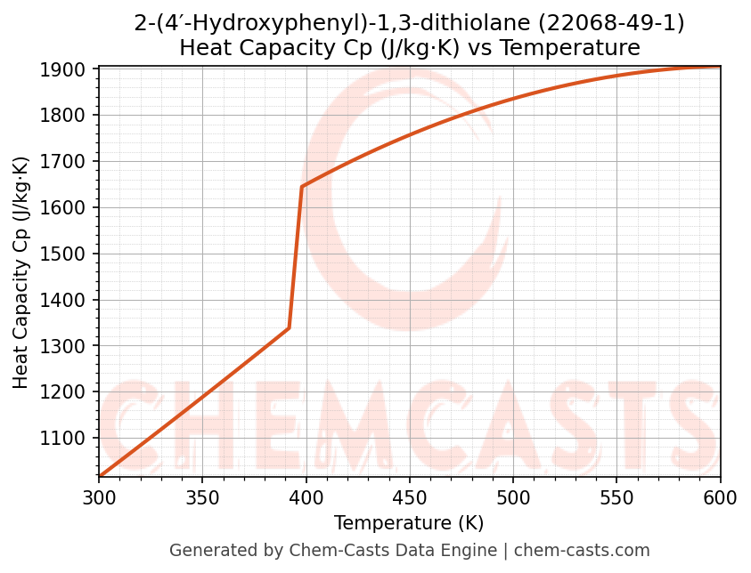 - Specific heat capacity (Cp) indicates the amount of energy required to raise the temperature of 2-(4′-Hydroxyphenyl)-1,3-dithiolane and is critical for energy balance and heat-exchanger design.