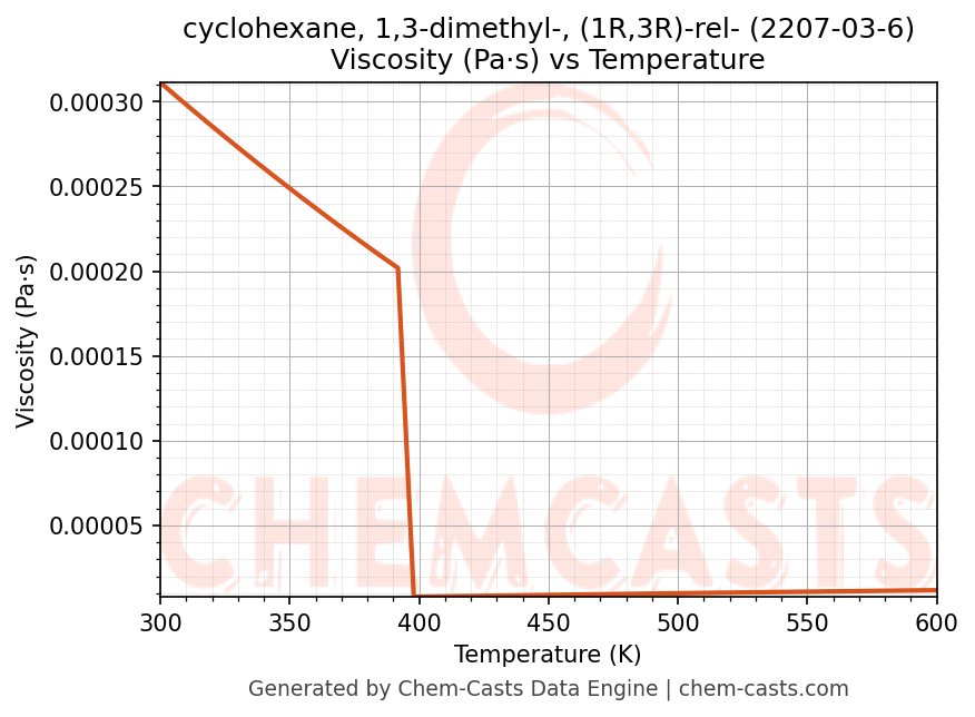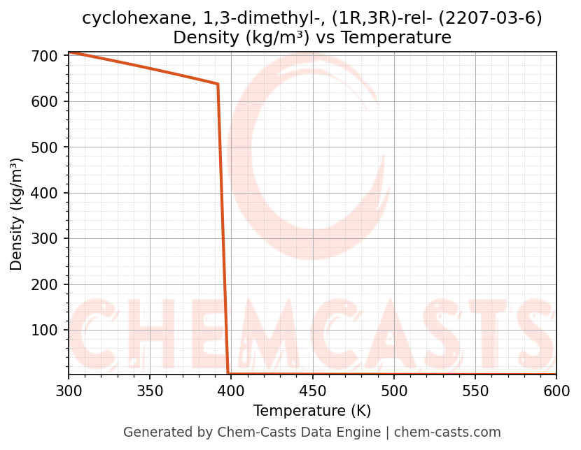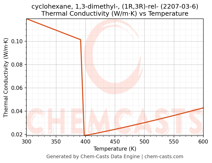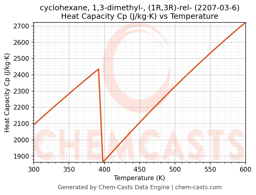 - Specific heat capacity (Cp) indicates the amount of energy required to raise the temperature of cyclohexane, 1,3-dimethyl-, (1R,3R)-rel- and is critical for energy balance and heat-exchanger design.