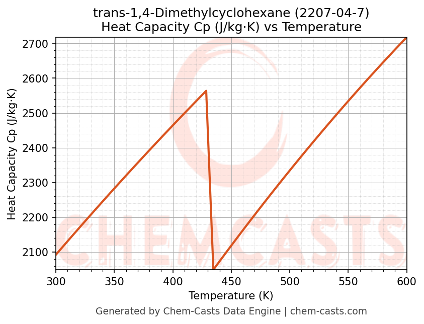 - Specific heat capacity (Cp) indicates the amount of energy required to raise the temperature of trans-1,4-Dimethylcyclohexane and is critical for energy balance and heat-exchanger design.
