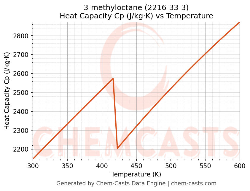 - Specific heat capacity (Cp) indicates the amount of energy required to raise the temperature of 3-methyloctane and is critical for energy balance and heat-exchanger design.