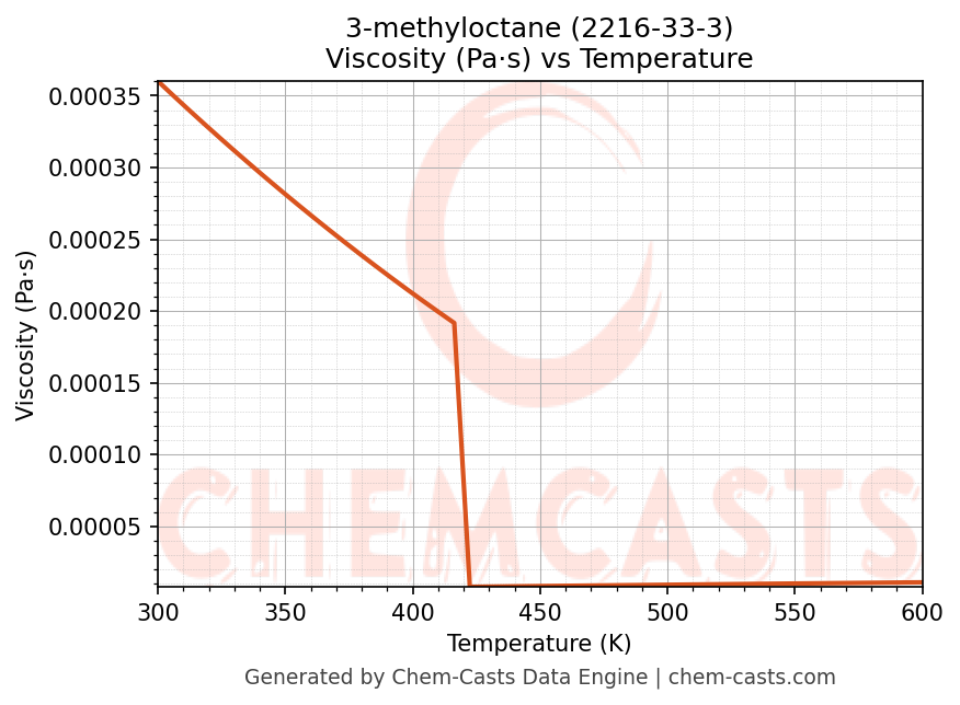 This page presents the temperature-dependent thermodynamic and transport properties of 3-methyloctane (CAS 2216-33-3) calculated at a constant pressure of 1 atm (101325 Pa) over the temperature range 250-500 K.