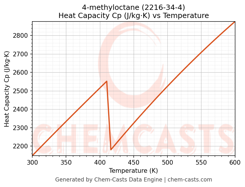 - Specific heat capacity (Cp) indicates the amount of energy required to raise the temperature of 4-methyloctane and is critical for energy balance and heat-exchanger design.