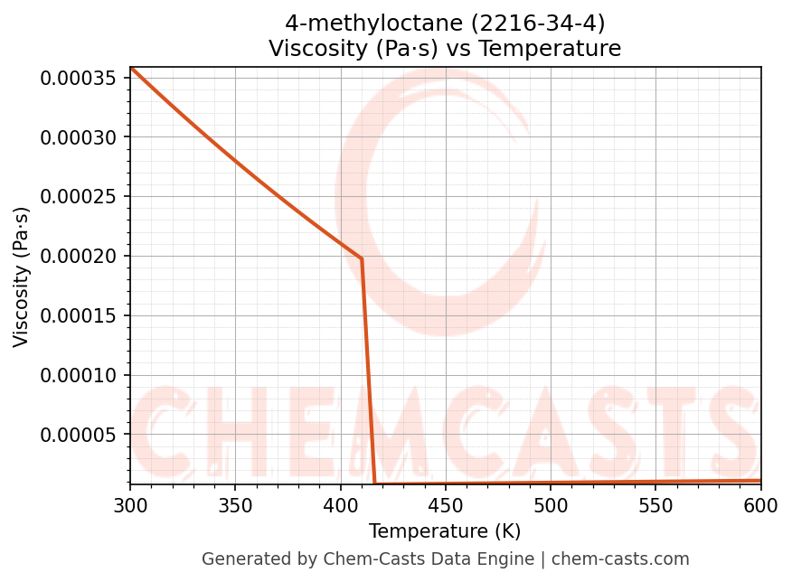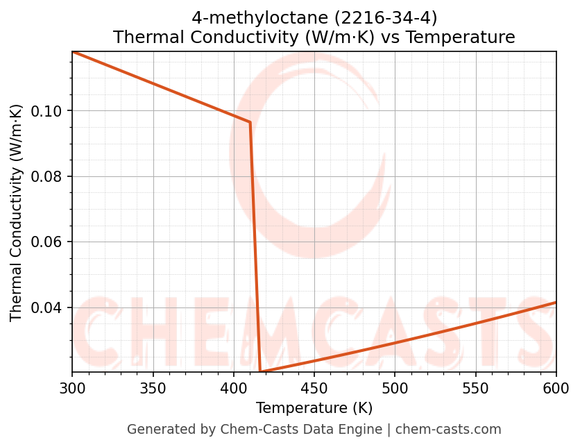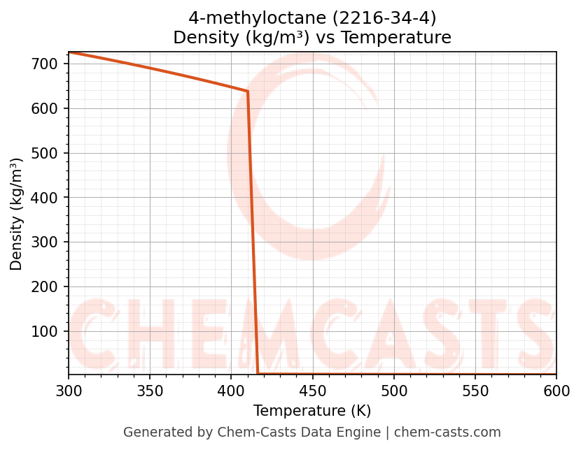 This page presents the temperature-dependent thermodynamic and transport properties of 4-methyloctane (CAS 2216-34-4) calculated at a constant pressure of 1 atm (101325 Pa) over the temperature range 250-500 K.