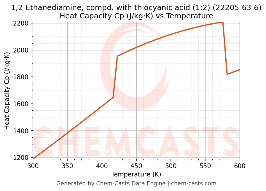 - Specific heat capacity (Cp) indicates the amount of energy required to raise the temperature of 1,2-Ethanediamine, compd. with thiocyanic acid (1:2) and is critical for energy balance and heat-exchanger design.