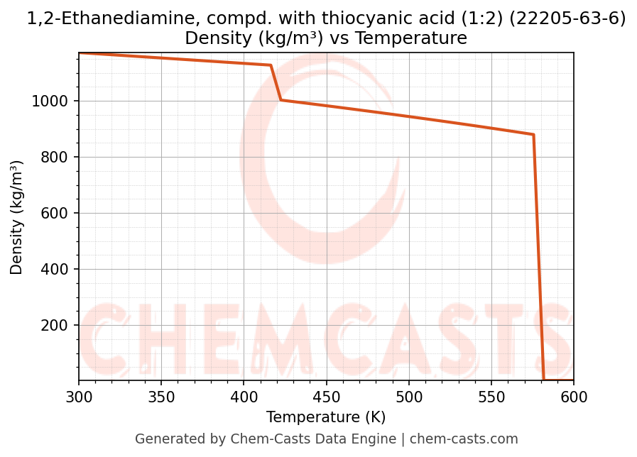 This page presents the temperature-dependent thermodynamic and transport properties of 1,2-Ethanediamine, compd. with thiocyanic acid (1:2) (CAS 22205-63-6) calculated at a constant pressure of 1 atm (101325 Pa) over the temperature range 250-500 K.