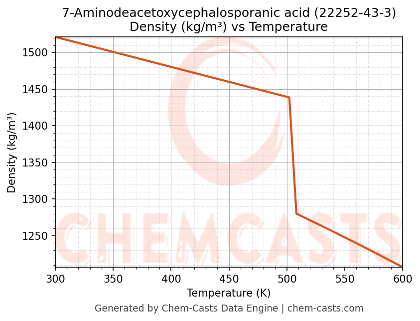 This page presents the temperature-dependent thermodynamic and transport properties of 7-Aminodeacetoxycephalosporanic acid (CAS 22252-43-3) calculated at a constant pressure of 1 atm (101325 Pa) over the temperature range 250-500 K.