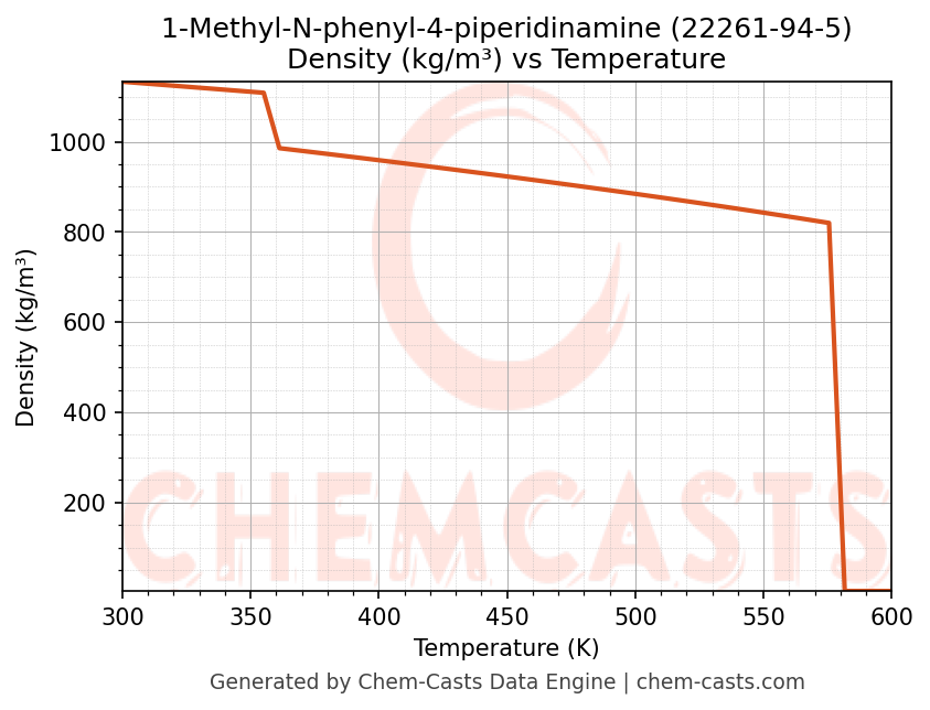 This page presents the temperature-dependent thermodynamic and transport properties of 1-Methyl-N-phenyl-4-piperidinamine (CAS 22261-94-5) calculated at a constant pressure of 1 atm (101325 Pa) over the temperature range 250-500 K.