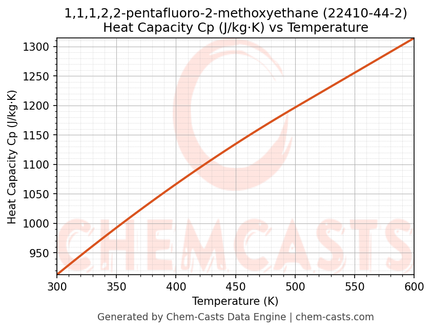 - Specific heat capacity (Cp) indicates the amount of energy required to raise the temperature of 1,1,1,2,2-pentafluoro-2-methoxyethane and is critical for energy balance and heat-exchanger design.